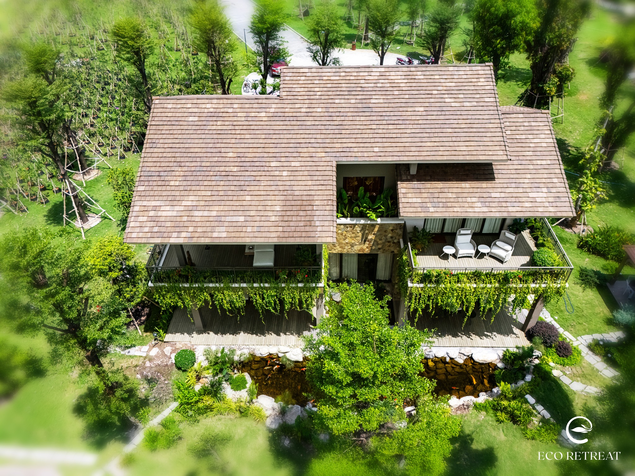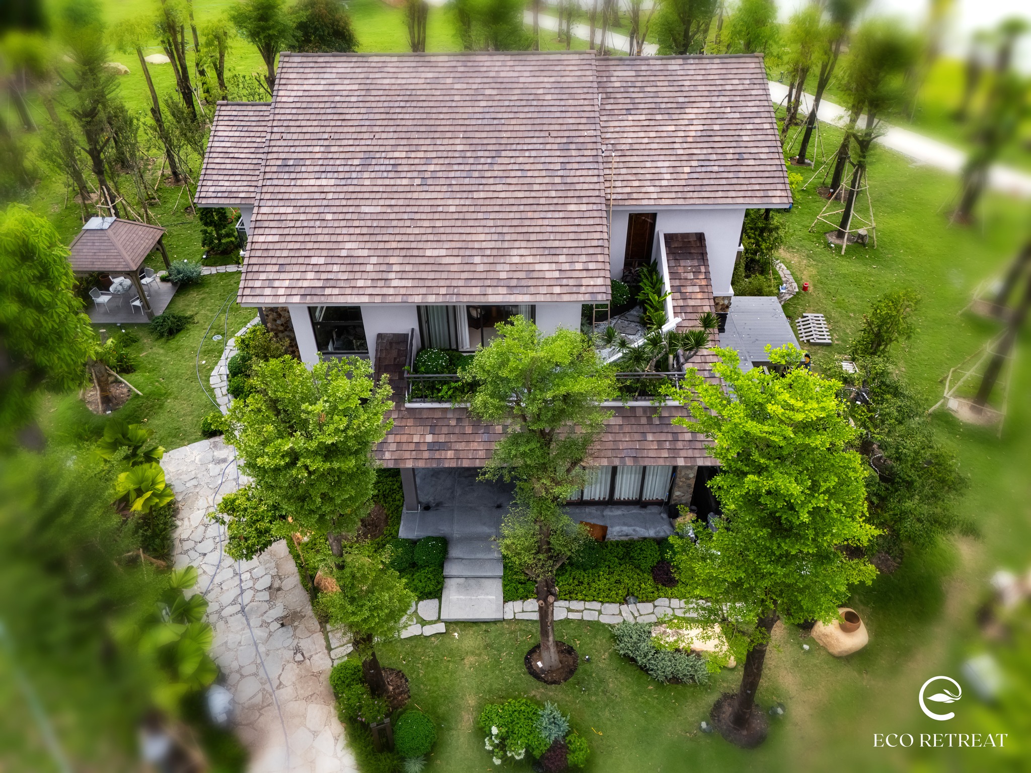 Một trong những dấu mốc đáng chú ý nhất trong tiến độ Eco Retreat tháng 5/2025 chính là Forest Clubhouse – công trình nằm ven hồ Thiên Nga, mang đậm dấu ấn thiết kế từ thiên nhiên nguyên bản kết hợp với cảm hứng văn hóa địa phương.