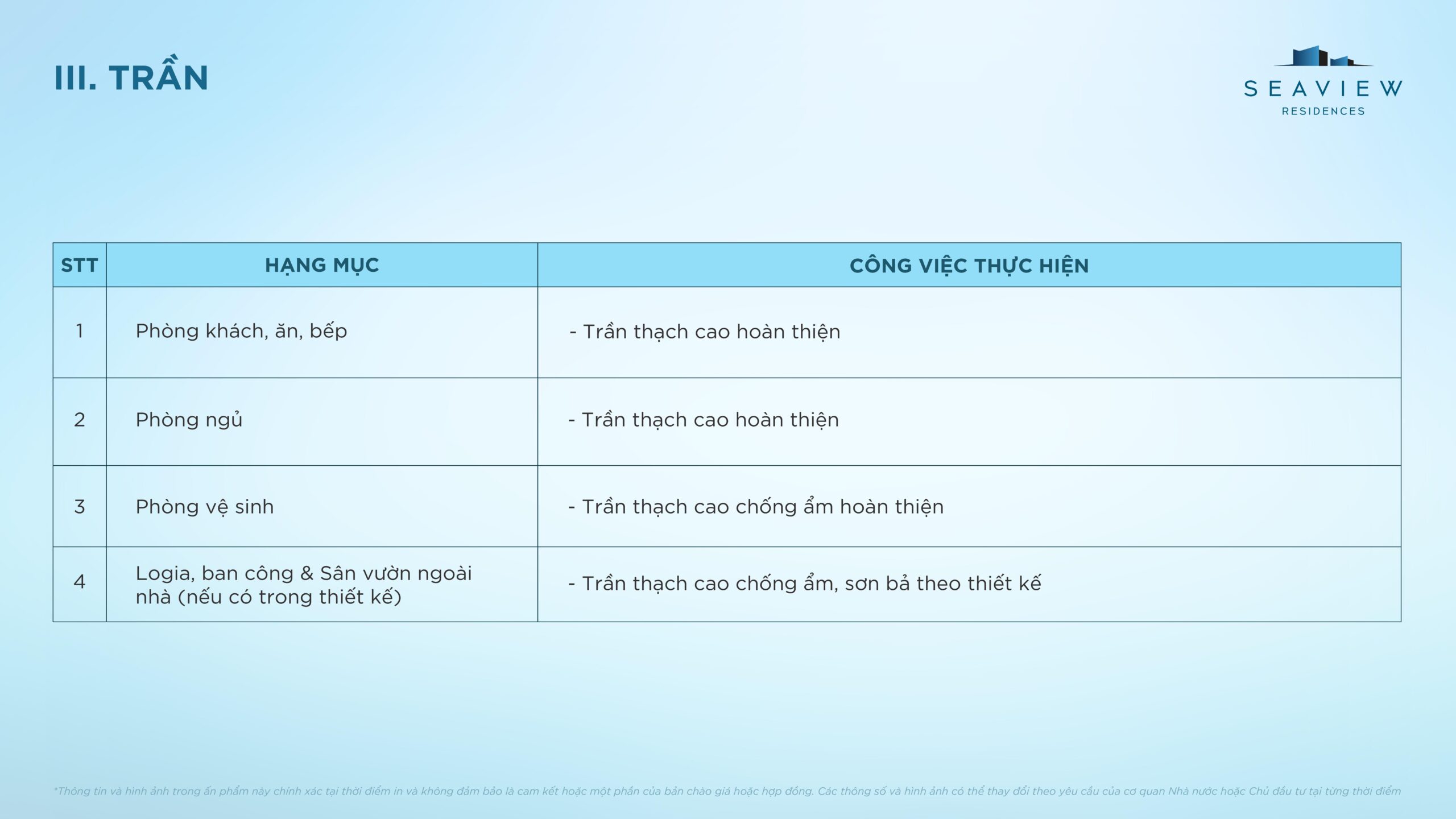 Đối với căn hộ Penthouse, chủ đầu tư chỉ bàn giao hoàn thiện các hạng mục: