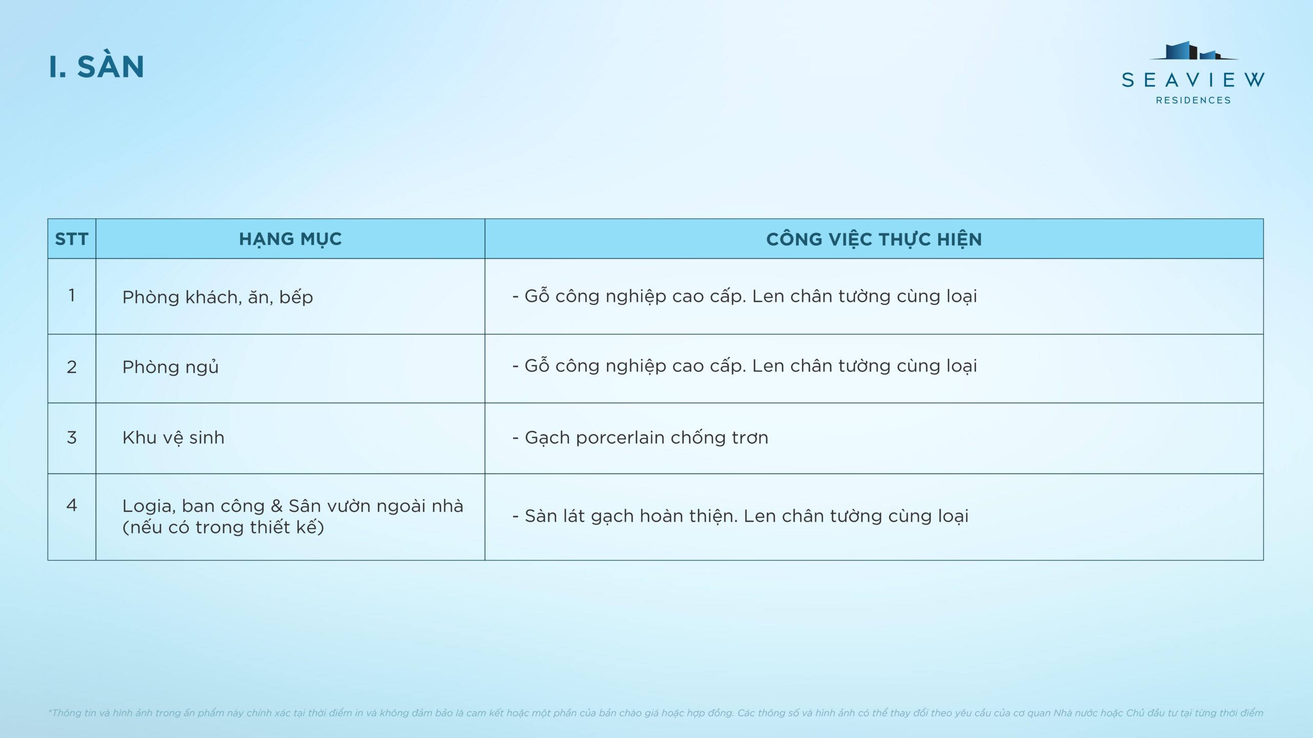Toàn bộ sàn phòng khách + bếp và phòng ngủ sử dụng gỗ công nghiệp; phòng vệ sinh sử dụng gạch porcerlain chống trơn; khu vực logia/ban công, sân vườn sàn lát gạch hoàn thiện. Len chân tường cùng loại.