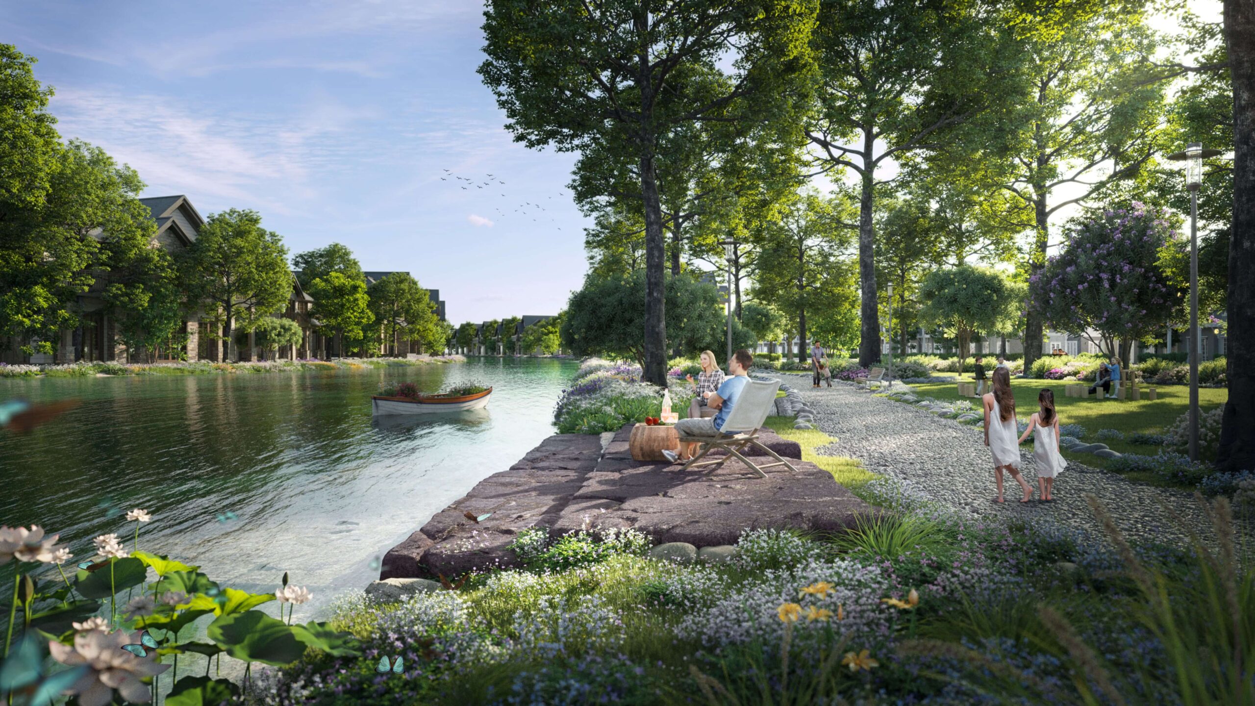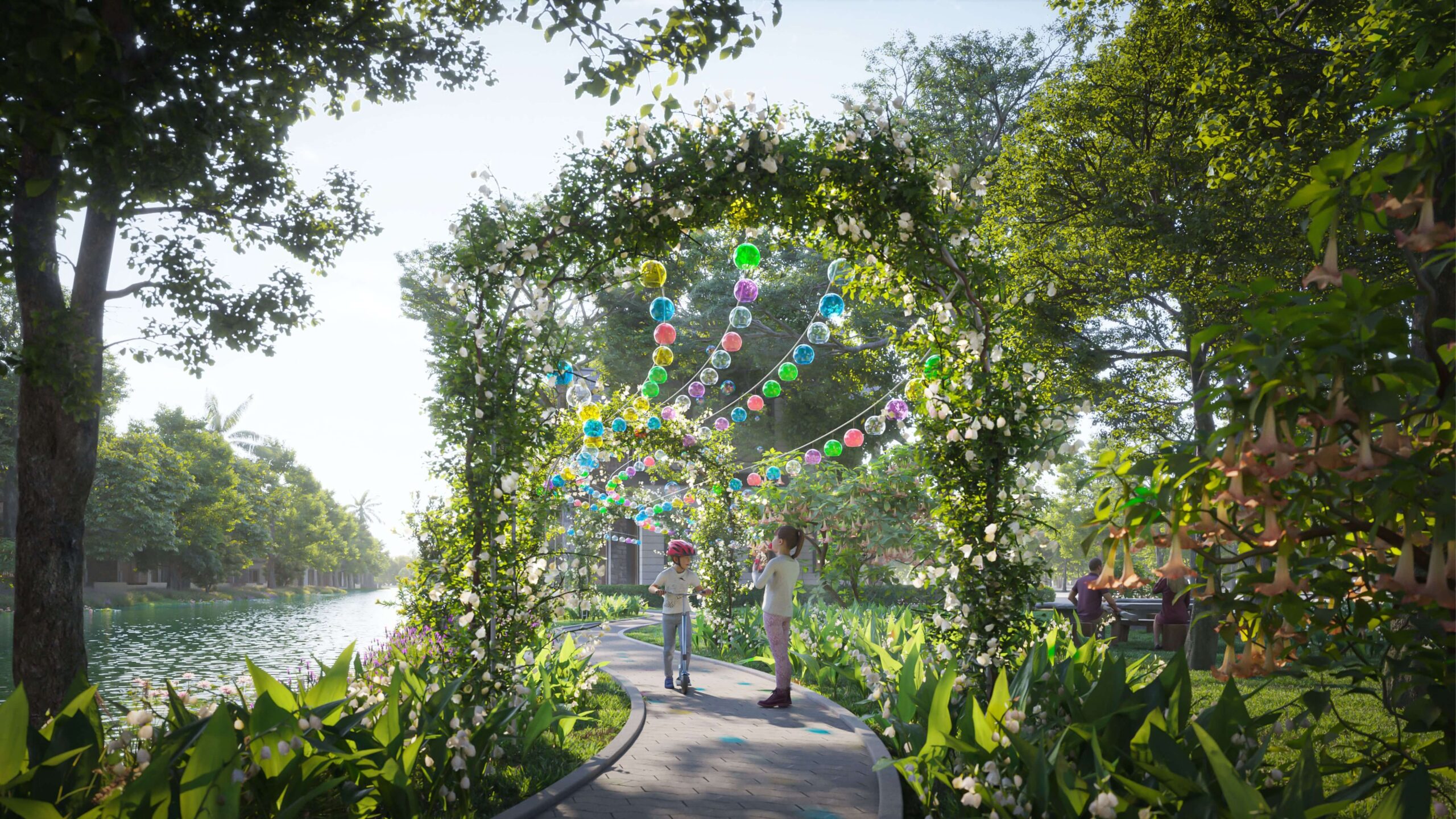 Phân khu Mùa Hạ nổi bật với quảng trường nước, đường dạo ven hồ, sân chơi trẻ em và khu BBQ ngoài trời.