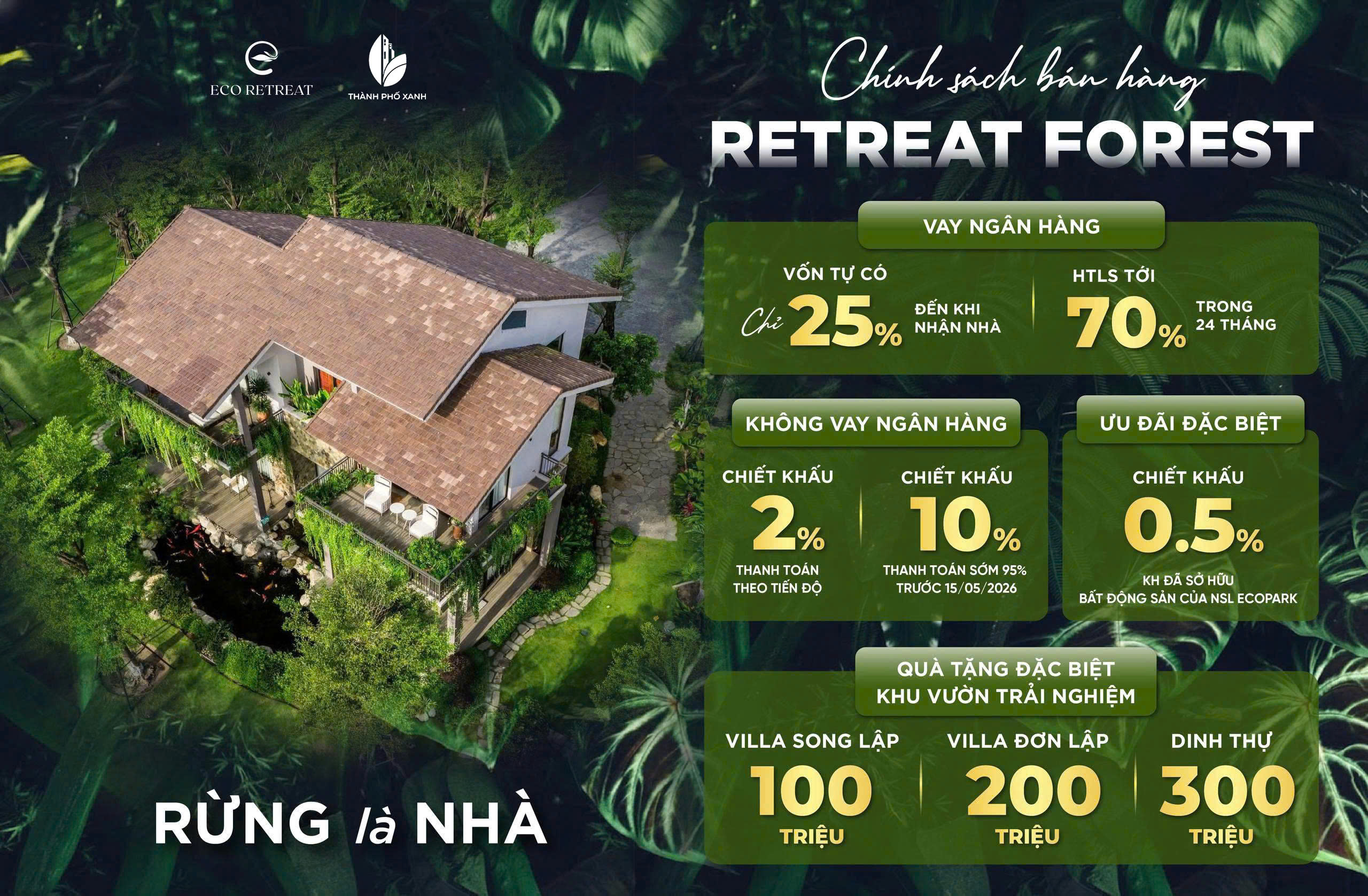 Phân khu Retreat Forest rộng 56,2 ha, nằm tại vùng lõi của khu đô thị sinh thái Eco Retreat. Dự án được quy hoạch với tỷ lệ 68% diện tích cho cảnh quan, 17% cho hạ tầng và chỉ 15% cho nhà ở. Cách bố trí này thể hiện định hướng quen thuộc của Ecopark – ưu tiên thiên nhiên, giảm mật độ xây dựng, tạo không gian sống cân bằng và bền vững.