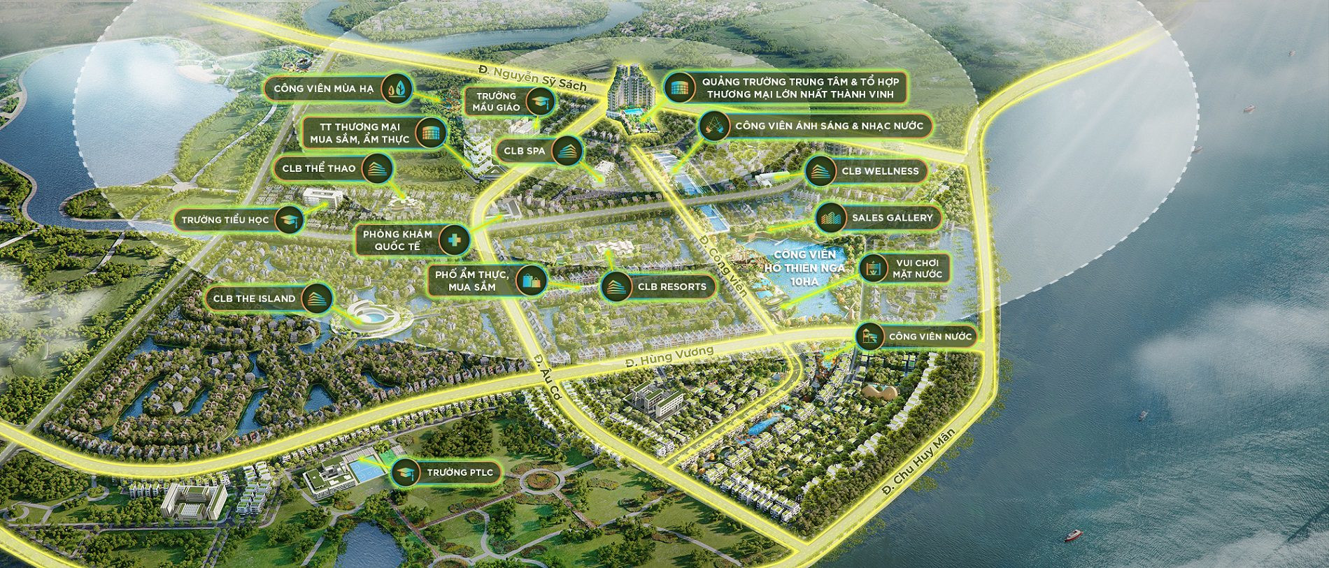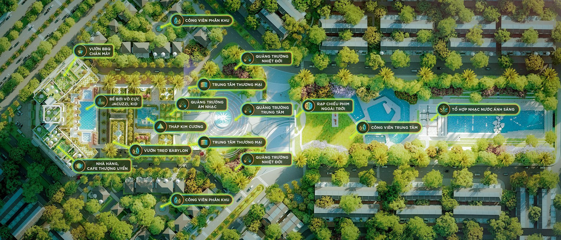 - Cùng với đó là hàng loạt tiện ích cao cấp khác đáp ứng mọi nhu cầu của cư dân và du khách: công viên trung tâm, công viên phân khu, quảng trường nhiệt đới, quảng trường âm nhạc, rạp phim ngoài trời, tổ hợp nhạc nước & ánh sáng, thiên đường mua sắm – ẩm thực bất tận, cùng vô vàn các góc phố café – nhà hàng lãng mạn.