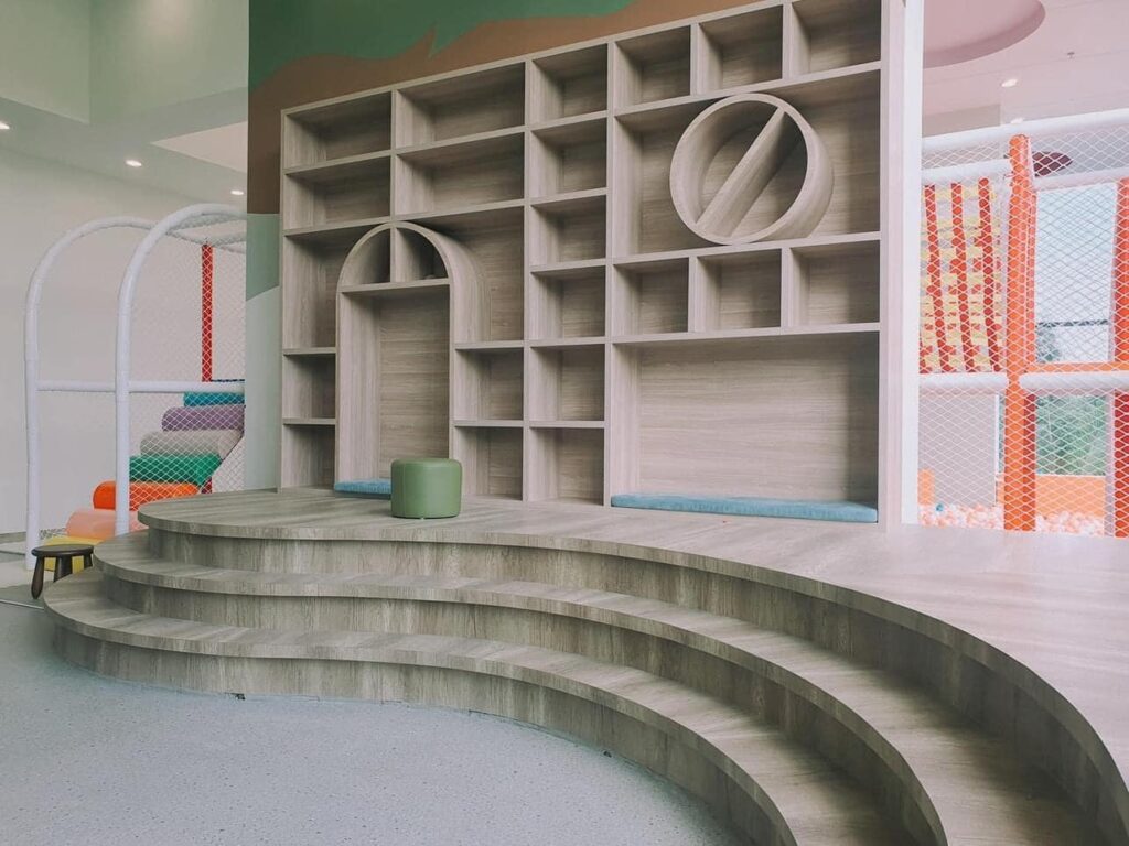 - Thác tràn nhiệt đới có độ cao hơn 10m, kết nối cùng với hồ bơi 4 mùa, đổ nước xuống hồ cảnh quan tại tầng trệt