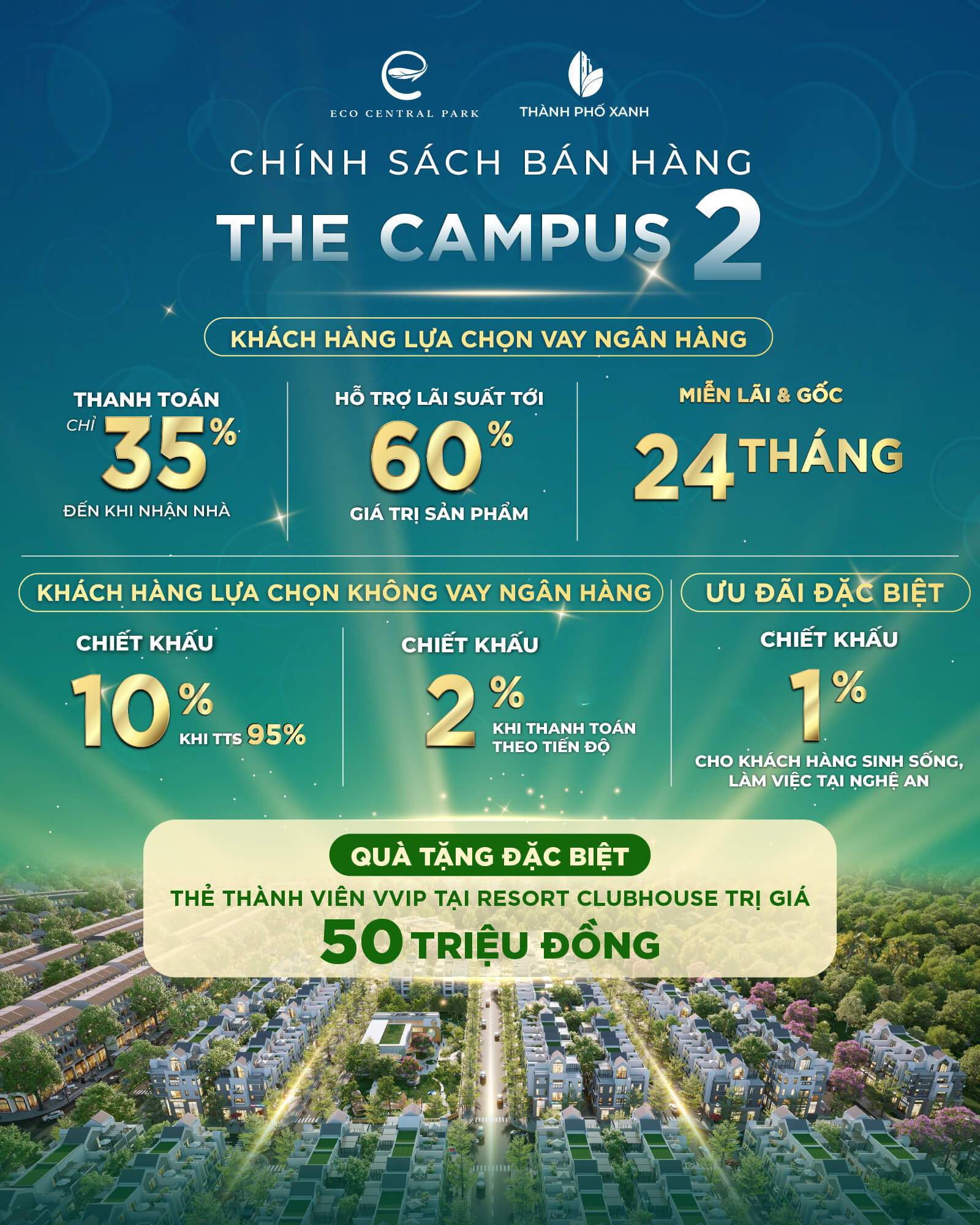 Nhờ lợi thế thương mại vượt trội và vị trí đắc địa của các tuyến đại lộ rộng lớn, The Campus 2 được hưởng lợi trực tiếp, nhất là khi tòa tháp Central Park Residences sắp đi vào bàn giao, trở thành tòa tháp cao tầng hiện đại bậc nhất Nghệ An hiện nay, mang đến nguồn nhu cầu tiêu dùng thương mại dịch vụ ngay trong các tuyến phố The Campus 2.