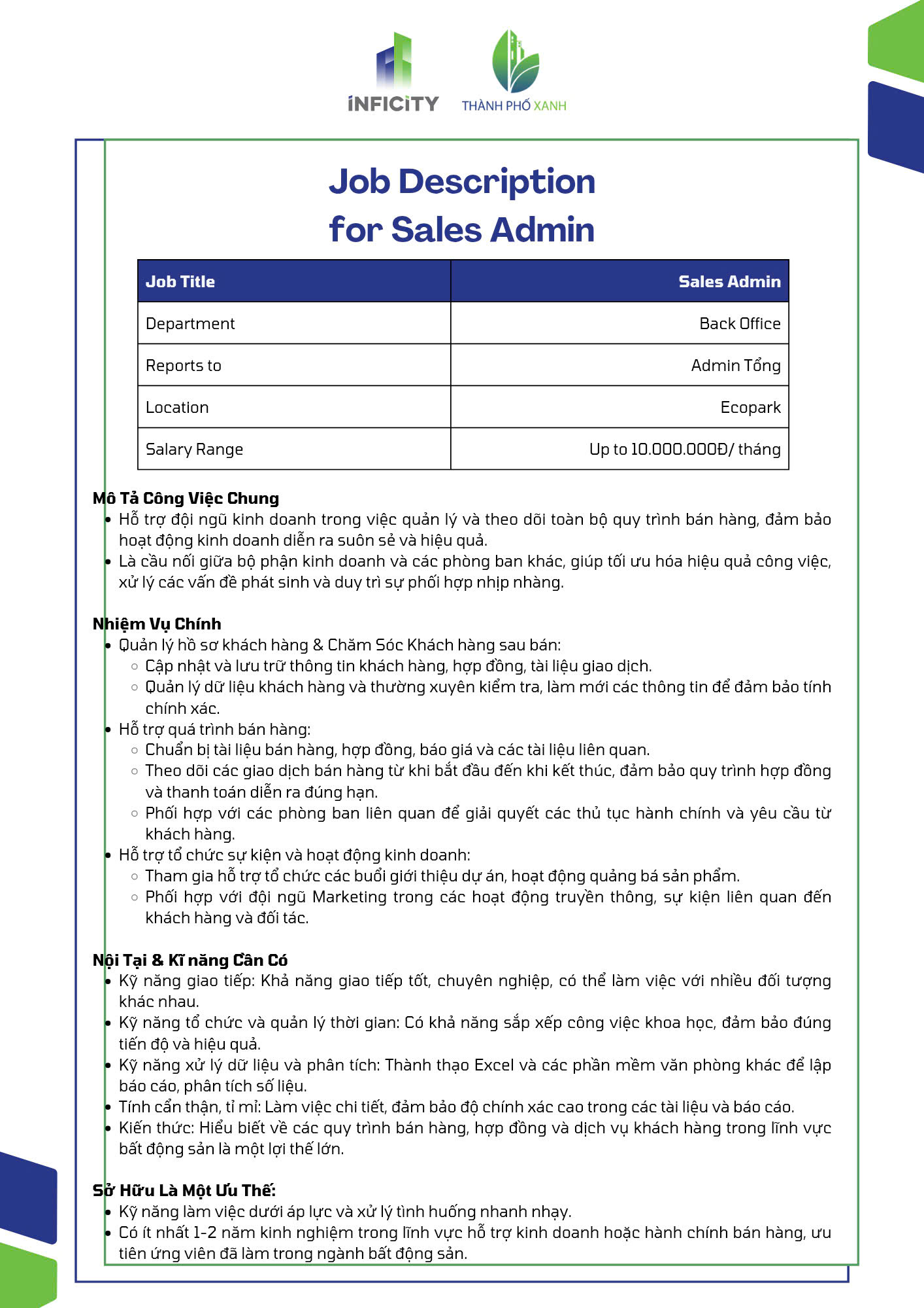 Bạn là người có khả năng tổ chức tốt, yêu thích sự cẩn thận và mong muốn làm việc trong môi trường chuyên nghiệp? Hãy gia nhập đội ngũ Sales Admin của chúng tôi tại Ecopark để có cơ hội phát triển sự nghiệp trong lĩnh vực bất động sản!