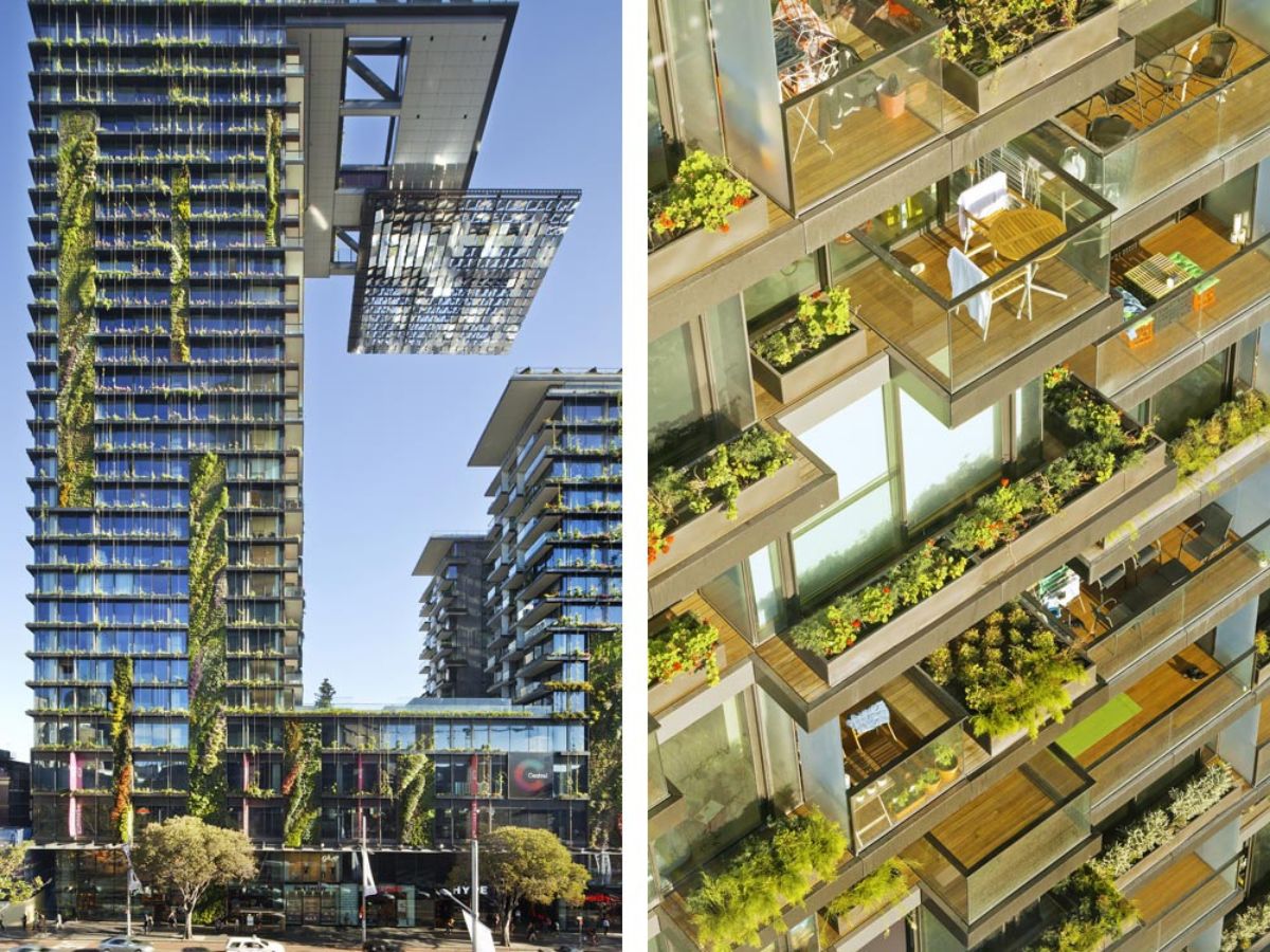 - One Central Park (Sydney, Úc): Tòa nhà nổi bật với khu vườn treo khổng lồ cùng hệ thống gương phản chiếu ánh sáng mặt trời xuống các tầng thấp, giúp tiết kiệm năng lượng và tăng chất lượng sống.